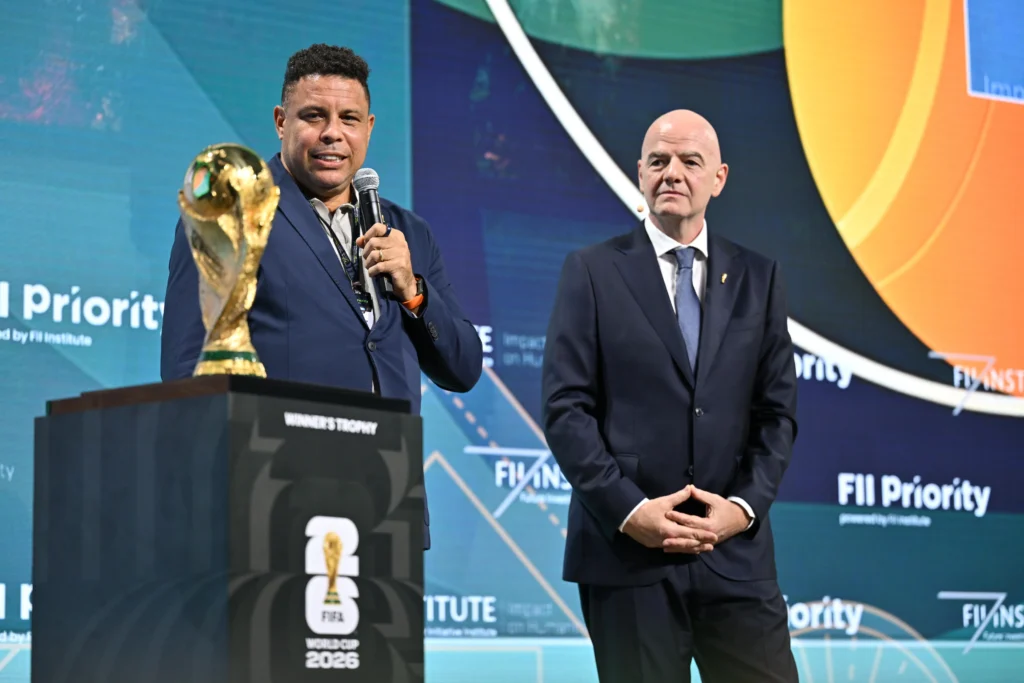 Gianni Infantino, President of FIFA, on stage with legendary Brazilian former football star Ronaldo Fenômeno and the World Cup trophy next to them, talked about the staggering economic impact of the World Cup.