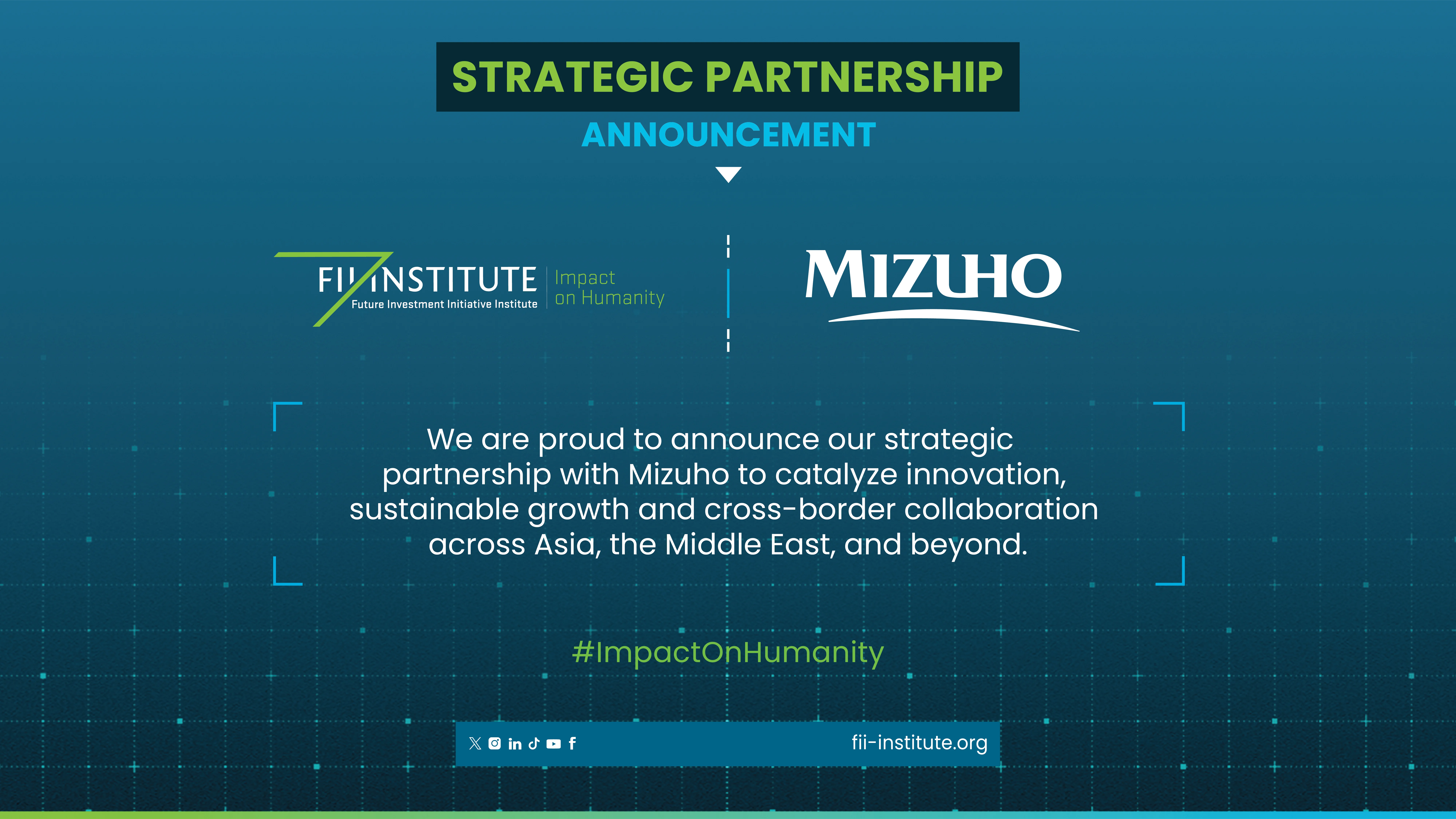 Riyadh, Saudi Arabia, October 17, 2025 – The Future Investment Initiative (FII) Institute proudly welcomes Mizuho, one of the world’s leading financial institutions, as a new Strategic Partner ahead of the FII Institute flagship conference in Riyadh, FII9, from October 27-30, as well as a Presenting Partner for the upcoming FII PRIORITY Asia Summit, taking place in Tokyo on November 30, December 1.