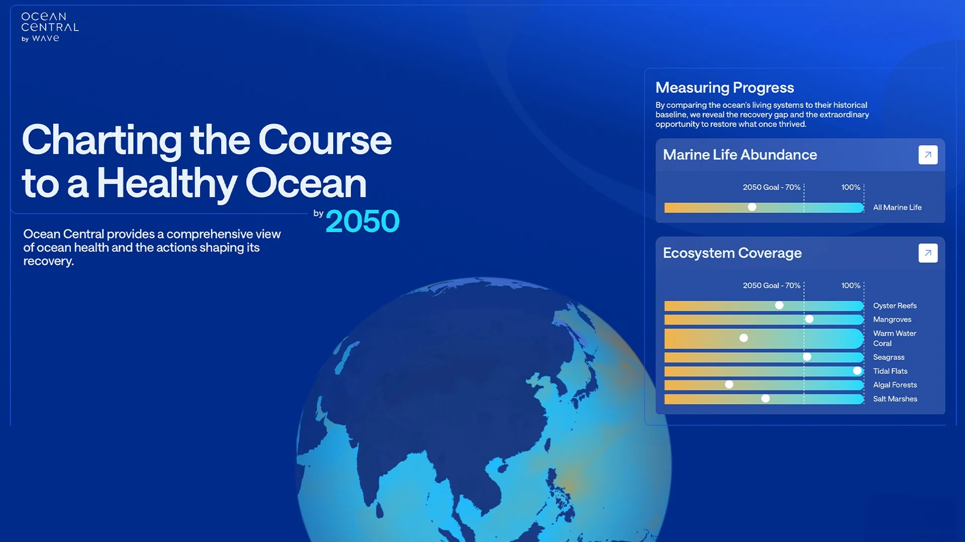 Integrating global targets from the U.N. Sustainable Development Goals, the Kunming-Montreal Global Biodiversity Framework, and the Paris Agreement, Ocean Central monitors progress towards goals, highlights successful initiatives and exposes critical knowledge gaps.